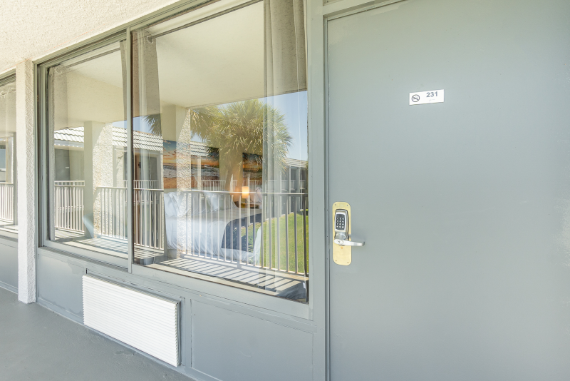 Step into your Sunshine Suite, a stunning, contemporary haven thoughtfully equipped for your comfort. Positioned on the second floor, this unit boasts a picturesque view of the outdoor swimming pool and garden area, setting the scene for a truly tranquil retreat. Inside, you'll find two plush queen-size beds adorned with fresh linens, ensuring a rejuvenating night's sleep. Stay connected with complimentary Wi-Fi and unwind with entertainment on the 65” flat-screen TV.