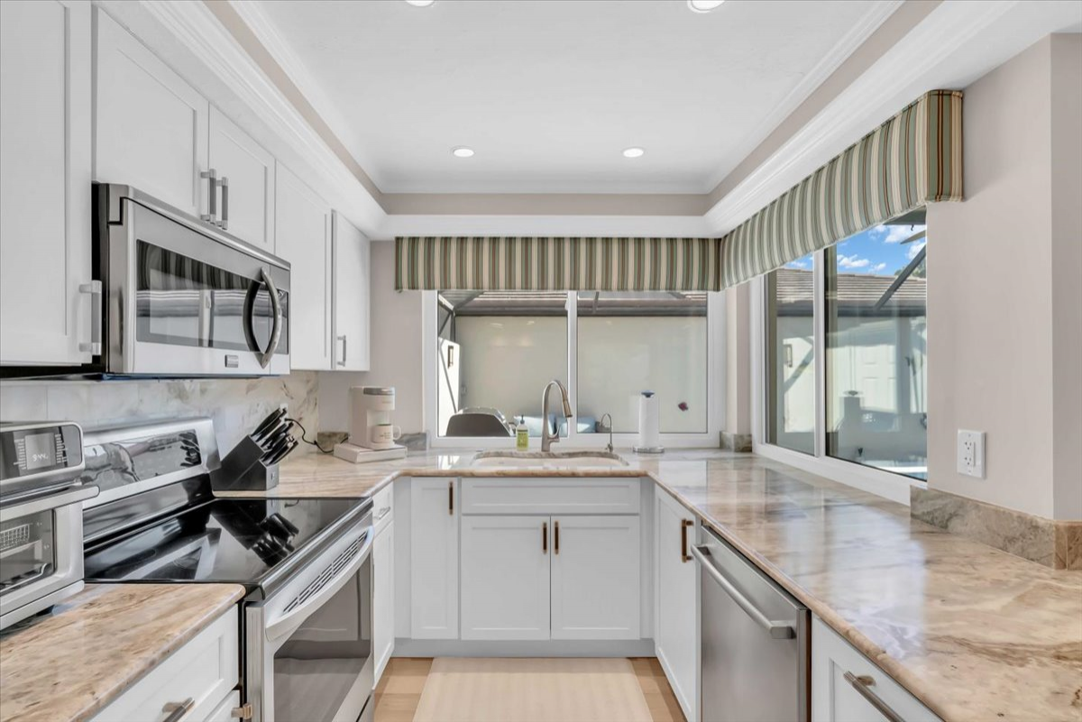The recently renovated home boasts an open floor plan and plenty of natural light. The fully stocked kitchen with quartz countertops is perfect for entertaining friends and family while they enjoy the pool just steps away. With two bedrooms, a two-car garage, and laundry room conveniently located off the living room, everything you need is within reach.