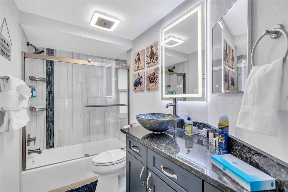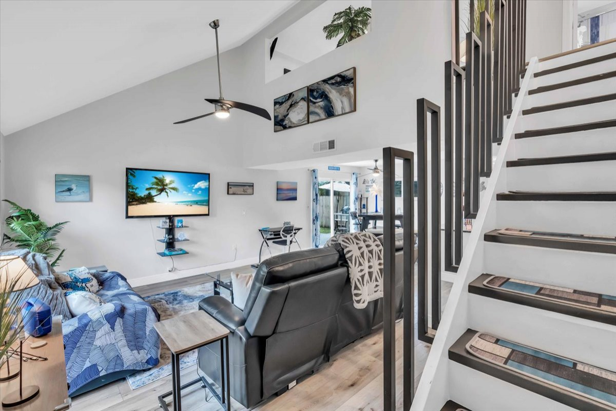 Welcome to our delightful 2 bedroom, 2 full bath home in beautiful Sarasota! Whether you are looking for a getaway for 2 or a small friends gathering, this cozy living space will provide everything you are looking for. Rest in the lovely living area unwinding after a day of exploring, playing games or watching movies while popping popcorn in your own popcorn maker! Step outside to the great outdoor space, with an enclosed back yard, making it an oasis for both relaxation and play, and featuring a BBQ area, outdoor dining table and comfy furniture. Pet lovers will appreciate that this home allows up to two dogs making everyone happy! The fully stocked kitchen is ideal for preparing delicious meals and snacks with a full bathroom downstairs for your convenience. The two bedrooms upstairs include a king and queen bed respectively and share a full bathroom in between.