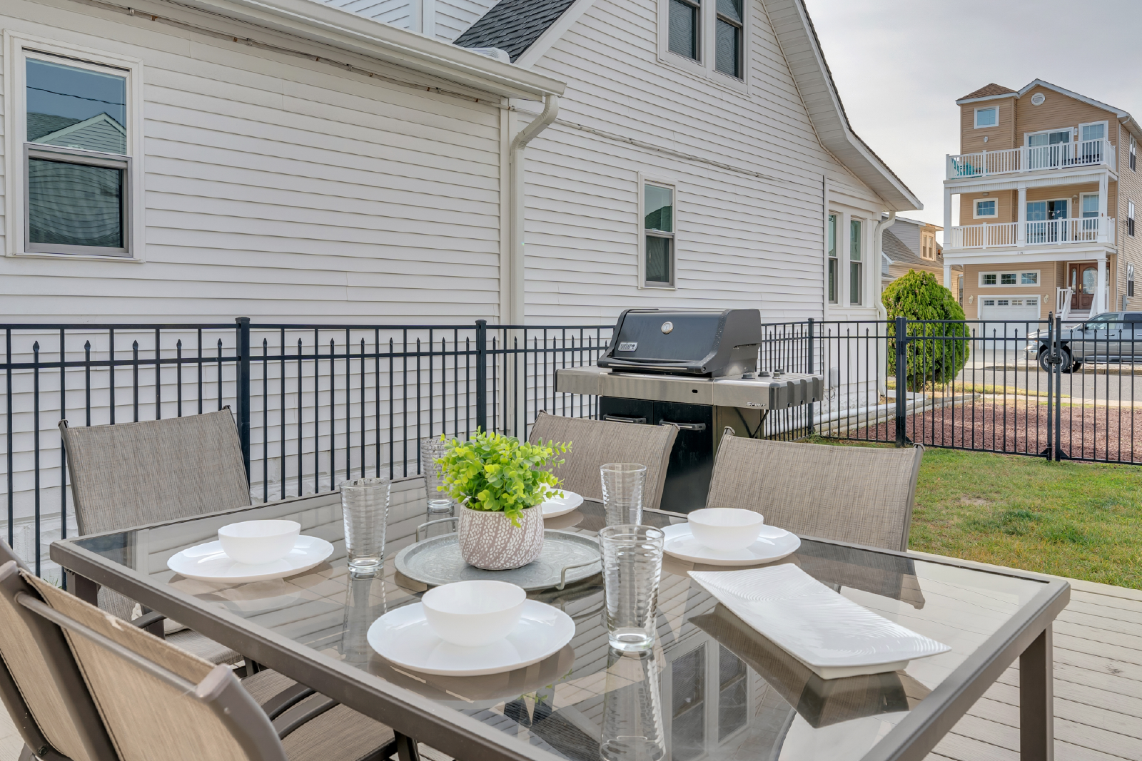- Outdoor Living: Relax on the large front porch (complete with retractable awning to keep you cool), or enjoy outdoor meals on your BBQ grill, perfect for after-beach cookouts. The private, fenced in yard also features an outdoor shower, and convenient storage area stocked with beach gear.