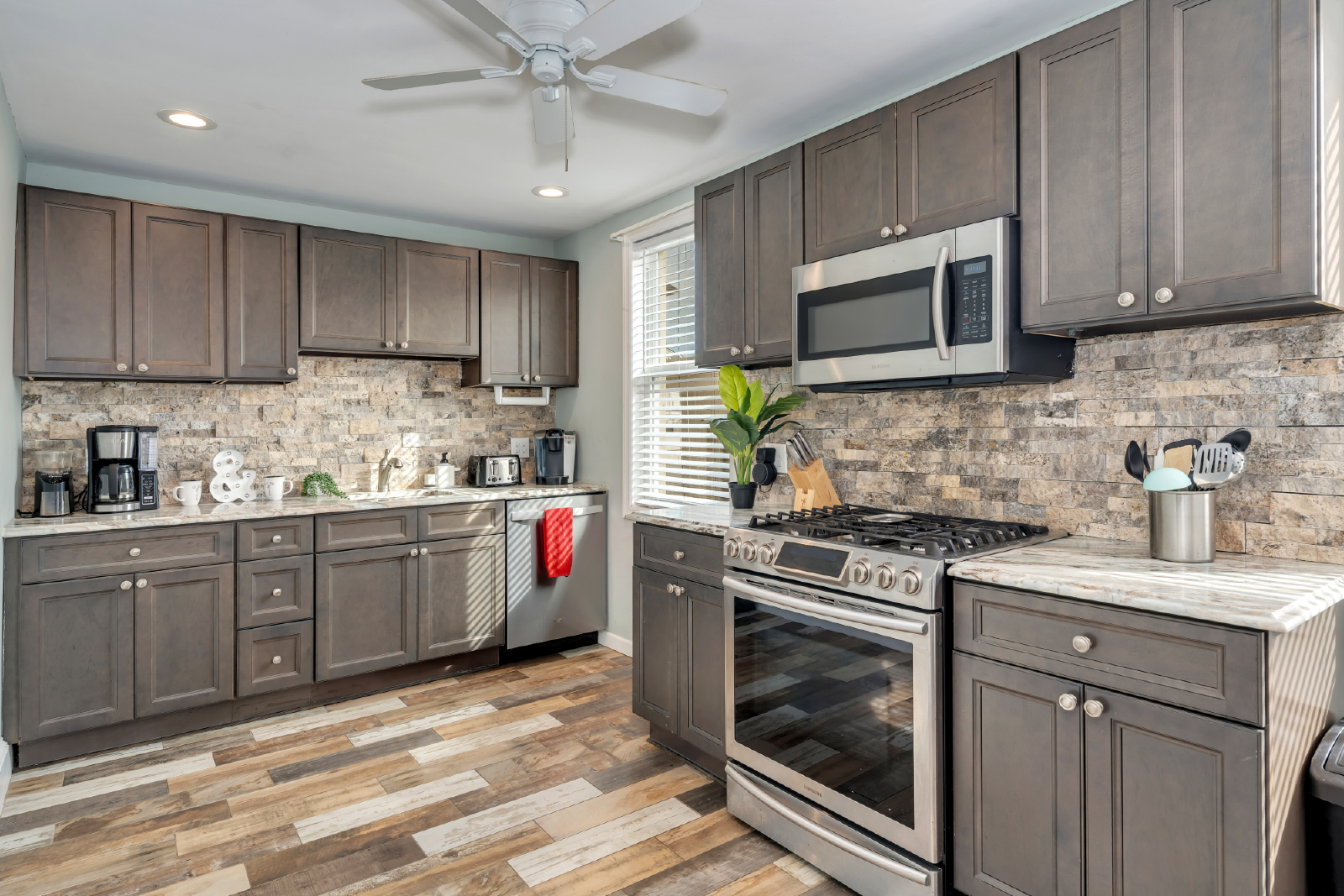 - Well-Equipped Kitchen: The well-stocked kitchen has everything you need to prepare home-cooked meals, complete with modern appliances, cookware, drip coffee maker and Keurig, and plenty of space to dine in or al fresco.