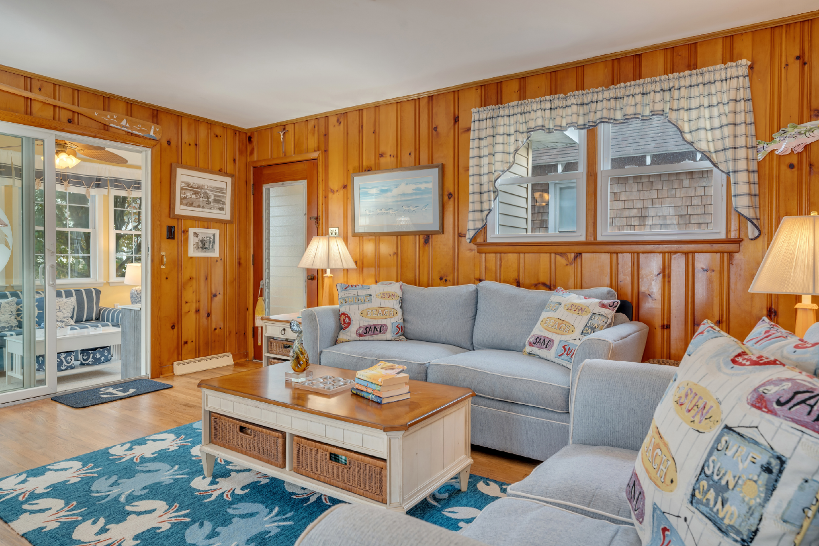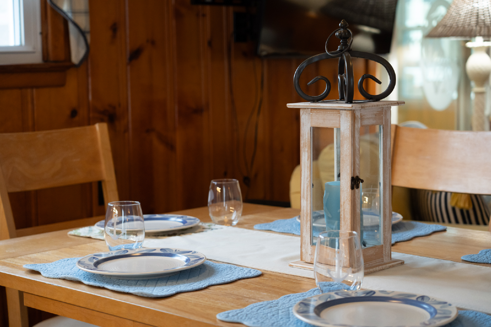 Upon arrival, you’ll find off-street parking for at least three vehicles. Step in the main entrance and be welcomed into a tastefully decorated home featuring an open concept living room and dining area with lots of natural light and a renovated and fully stocked kitchen with ample cabinet space. Off the main living space is a sunny four-season front room with a vaulted ceiling, comfy seating and a closet full of family-friendly games. It’s a perfect space to enjoy your morning coffee, play board games, or curl up with a book.