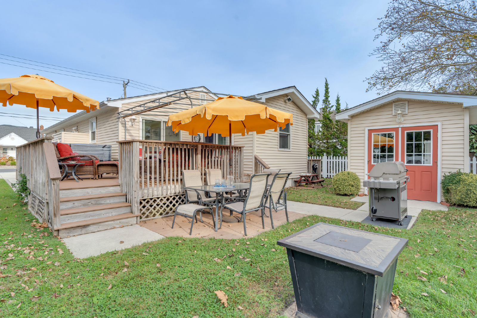The two back bedrooms have sliding doors that open to a spacious deck with an awning to keep you cool on the hot summer days, comfortable furniture, and an inviting backyard. Enjoy the propane fire pit, space to play corn hole or your favorite yard games, plus there is a dining table and chairs in the backyard for you to enjoy the dinner you prepare on the outdoor gas grill.
