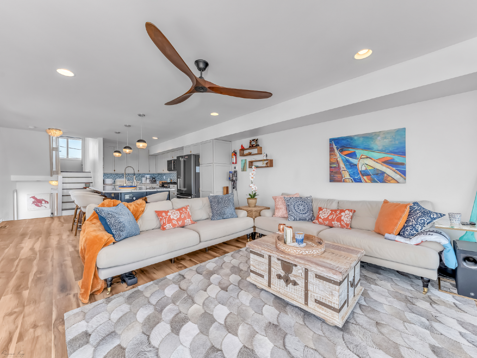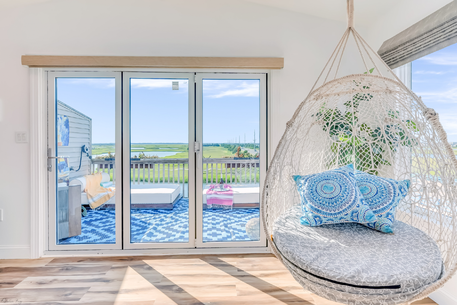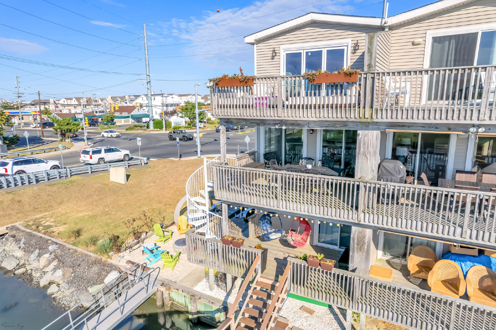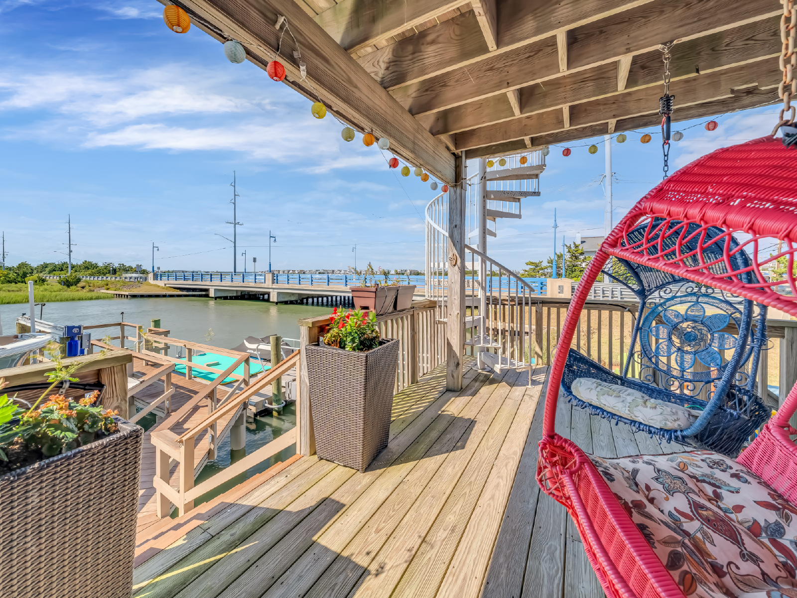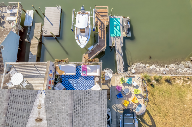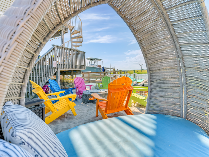 On the lower level, you'll find a bedroom (Queen), plus a second bedroom (Queen) that is bay front with sliding glass doors that lead to the patio, where you can lounge (or snap Insta-worthy pics) in the brightly colored hanging basket chairs overlooking the bay. A full bathroom with a spa-like shower, and full-size washer and dryer complete this level. Up one set of stairs is the third bedroom (1 Full, 1 Twin), and shared full bath. Next stop: your main living level: a stunning open kitchen with large island for dining and gathering...which flows into the living room. The living space is accented by two sliding glass doors that afford stunning bay views, and quick access to the outdoor dining table on the covered deck. Next up: bedroom 4 (1 Full, 1 Twin), with a desk, and stylish en suite bathroom. Finally, the top floor is dedicated to the primary suite that boasts a King bed, beautiful modern bathroom with large shower and double vanity, plus glass doors that take you to your own private deck with generous space to lounge and soak up the priceless sunsets. The outdoor space is equally impressive and thoughtful: with a fire pit, outdoor shower, and plenty of dock space to enjoy the best of waterfront living. Note: this home does NOT have a grill.
