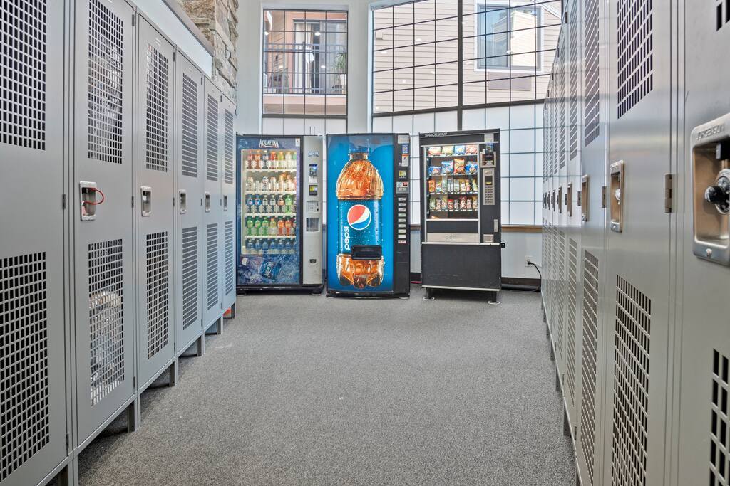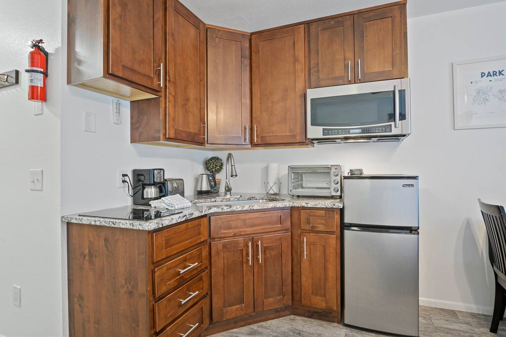 - Kitchenette with a refrigerator, microwave, coffee maker, and cookware.