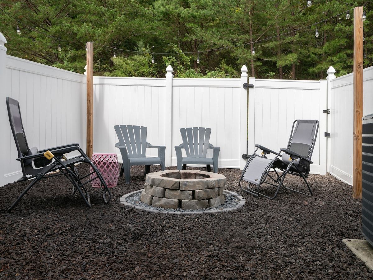 • The back patio is fully equipped with seating and a fire pit. Logs and a fire starter are provided, but usage is at your own risk. Fire extinguishers are available—one under the kitchen sink and another in the laundry room.